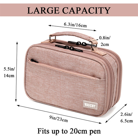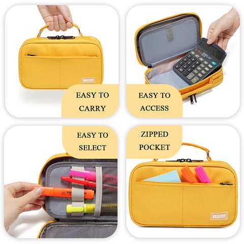 The VASCHY double zipper pencil case is designed with a convenient top handle to carry and three zipped compartments to keep the pens, pencils, markers, erasers, scissors, protractors well organized. It is made of sturdy polyester, this case is built to last. It is lightweight yet durable and highly tear-resistant, making it a perfect material for making pen cases that will stand up well to regular use.